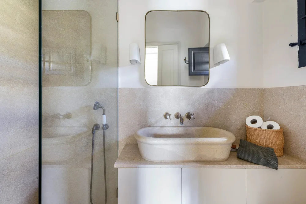 The retreat’s manicured garden, shaded by lemon and olive trees, offers a slice of paradise. Enjoy a refreshing swim in the private pool, its calm waters reflecting the architectural beauty and sky.
